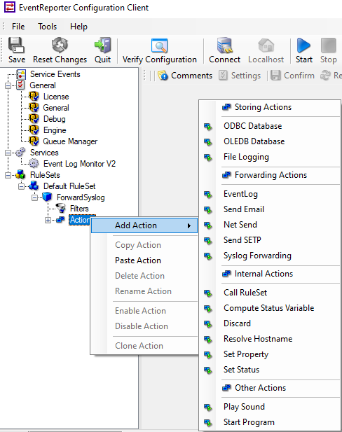 EventReporter has a powerful and flexible rule engine that processes all events based on a configured set of actions. An unlimited number of rules and actions allows tailoring to the specific needs.