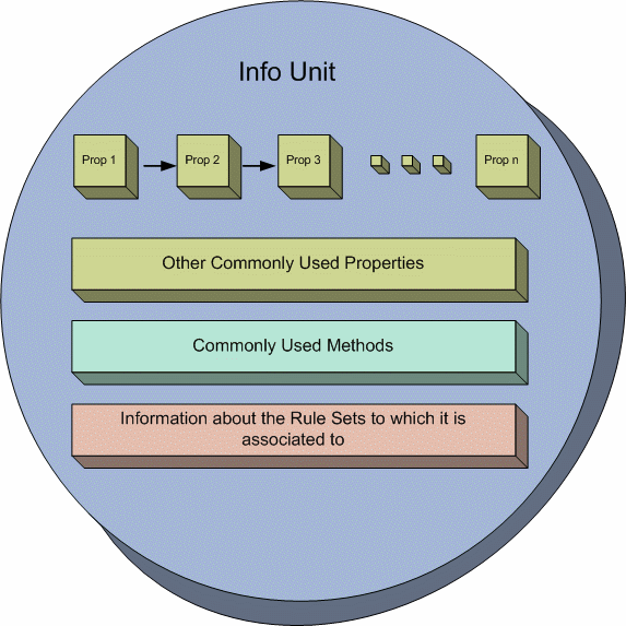 As the figure illustrates, an Info Unit contains most of the properties (mentioned above in bullets) in the form of a list. In addition to this list, it also has some commonly used properties separately stored in it (for efficiency reasons). Apart from the properties, an Info Unit also has some methods which allow it to write it or to construct itself etc. Information about the RuleSets (will be explained in the coming sections) is also contained within each Info Unit so that it exactly knows which rules will be applied on it.