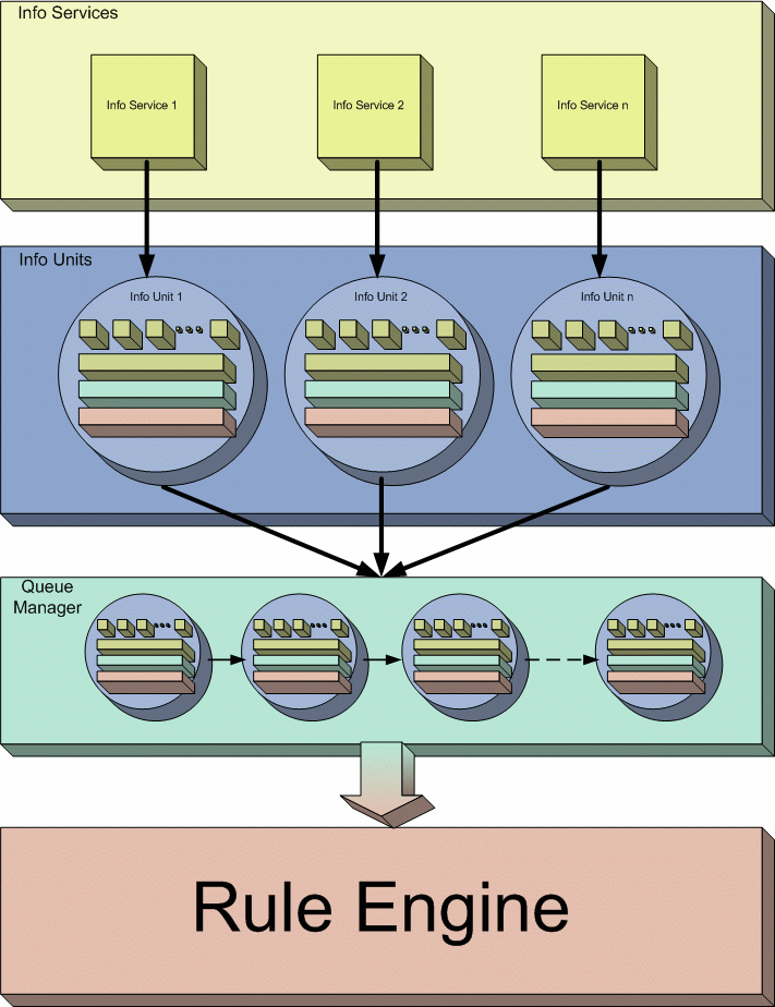 Info Services picks up the events and convert them into Info Unit. Note that each Info Service has its own Info Unit. These Info Units are passed to the Queue Manager. The job of the Queue Manager, as mentioned above and as clear from the diagram, is to simply make a queue of these Info Units that it has received from various Info Services. The Rule Engine picks up the Info Units from this Queue Manager, applies the rules on these Info Units (as mentioned above, each Info Unit has the information about which rules should be applied on it) and if necessary carries on the actions. The rule engine keeps on repeating this process while there are some Info Units present in the Queue.