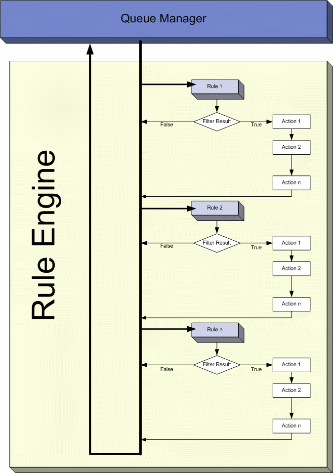 As you can see in the figure, the Rule Engine picks up Info Units one by one from the Queue Manager. Since each Info Unit has the information about its Rule sets, it will apply the rules on it in the same order in which they were defined. As you can see above, it will pick up the first Rule and evaluates its Filter Condition. If that Filter Condition is evaluated to false, all the actions associated with that rule will be skipped and it will pick up the second Rule. If the Filter Condition, on the other hand, evaluates to True, it will execute all the actions that are associated with this Rule in the order in which they were defined. After the execution of all these actions, it will pick up the next rule in the current ruleset. Once all the rules have been executed, the current Info Unit (that was handed over to Rule Engine by the Queue Manager) will be destroyed and the Rule Engine will go to the Queue Manager to pick up the next Info Unit if there exists one.