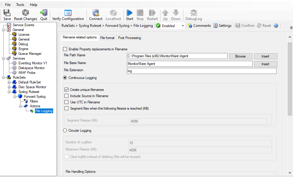 While building and testing your rule base, please keep in mind that the MonitorWare Agent service needs to be restarted to load a modified rule base. The reason is that the service does not re-read the rule base to save system resources.