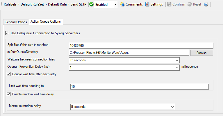 When the Action is processing syslog cache files, an overrun prevention delay can be added to avoid flooding the target Syslog server.