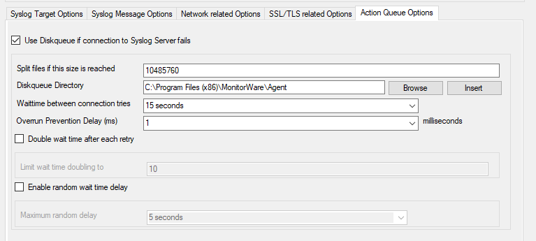 If enabled, a some random time will be added into the waittime delay. When using many syslog senders, this can avoid that all senders start sending cached syslog data to the Syslog server at the same time.