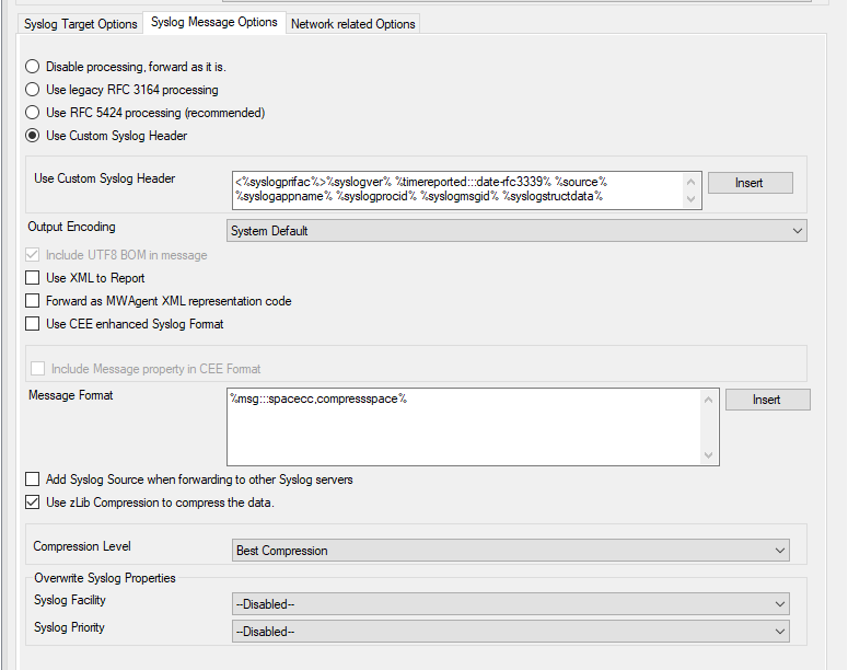 With this option you can set the grade of compression for your syslog messages. For more information please read the note at the bottom of this page.