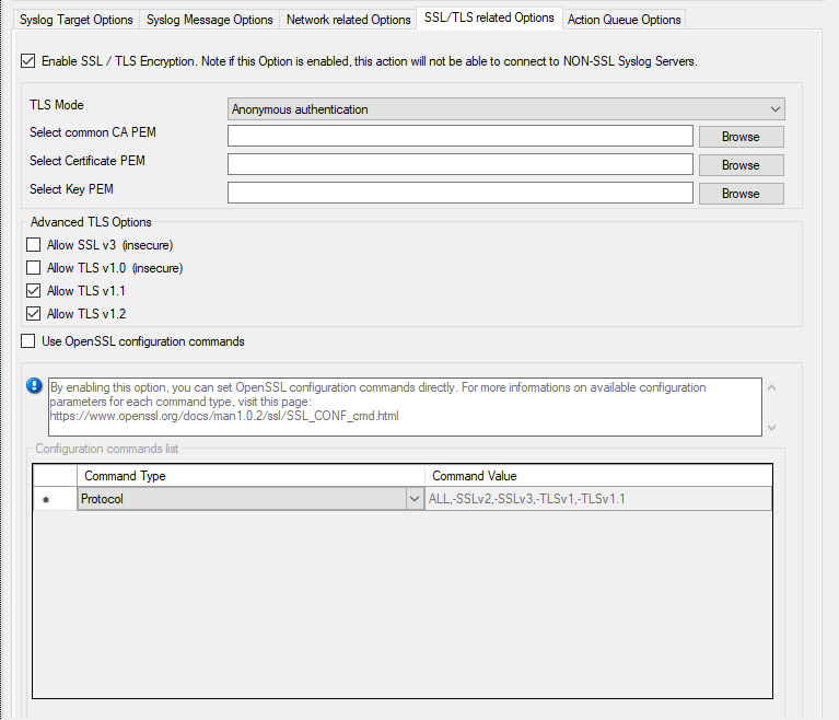 TCP mode comes in three flavors. This stems back to the fact that transmission of syslog messages via plain TCP is not yet officially standardized (and it is doubtful if it ever will be). However, it is the most relevant and most widely implemented reliable transmission mode for syslog. It is a kind of unwritten industry standard. We support three different transmission modes offering the greatest compatibility with all existing implementations. The mode “TCP (one message per connection)” is a compatibility mode for Adiscon servers that are older than roughly June 2006. It may also be required for some other vendors. We recommend not to use this setting, except when needed. “TCP (persistent connection)” sends multiple messages over a single connection, which is held open for an extended period of time. This mode is compatible with almost all implementations and offers good performance. Some issues may occur if control characters are present in the syslog message, which typically should not happen. The mode “TCP (octet-count based framing)” implements algorithms of an IETF standard RFC 6587. It also uses a persistent connection. This mode is reliable and also deals with embedded control characters very well. This standard is now widely supported by modern syslog receivers and implementations.