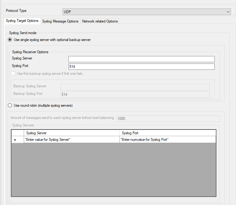 Use single Syslog server with optional backup server This is the classic syslog send mode which uses a primary Syslog server and a secondary backup Syslog server if configured.