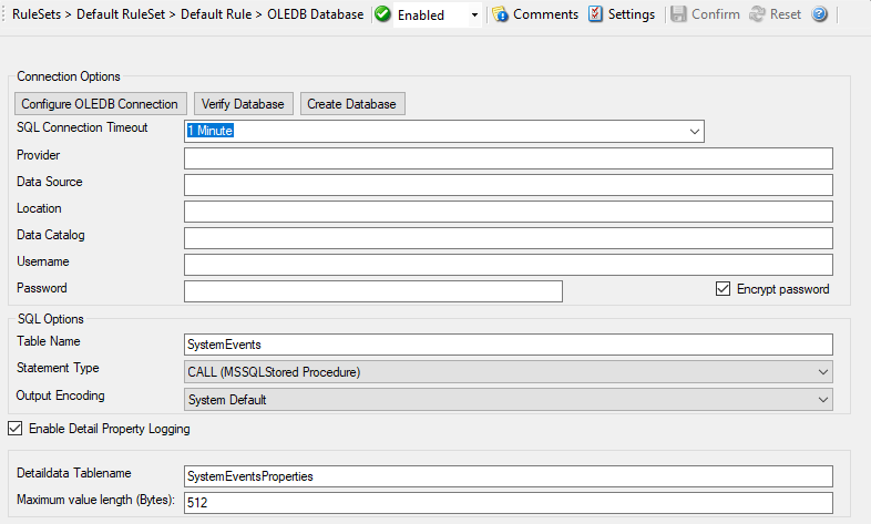 This action serves the same main use cases as ODBC Database Options, but it connects through OLEDB instead of an ODBC System DSN. It can write to the built-in Adiscon default schema or to a user-defined schema. Provider availability depends on your Windows environment and the database vendor’s current OLEDB support.
