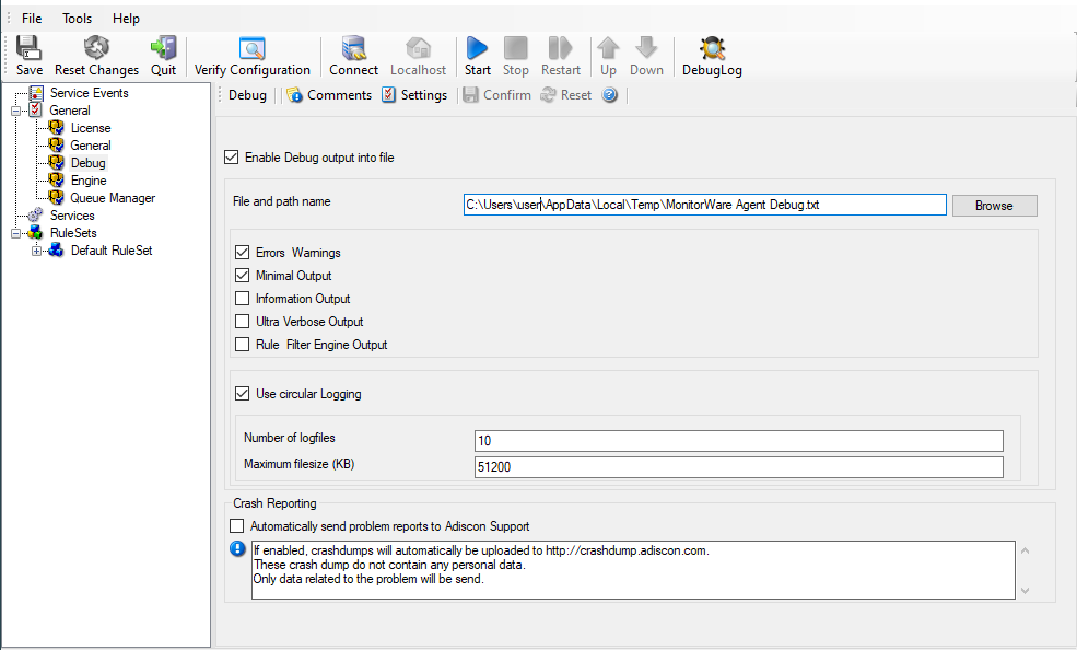 These checkboxes control the amount of debug information being written. We highly recommend only selecting “Errors & Warnings” as well as “Minimum Debug Output” unless otherwise instructed by Adiscon support.