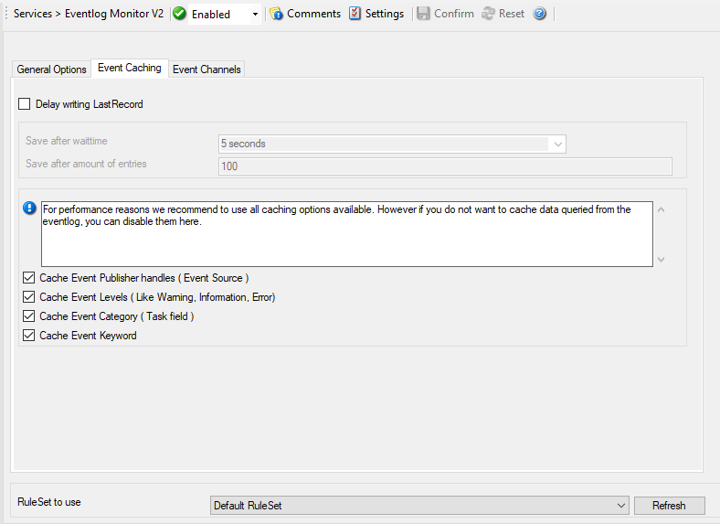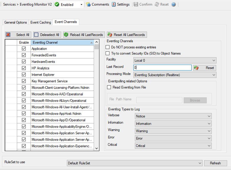 The V2 Eventlog Monitor provides the ability to monitor so-called “log channels”. Each channel can work either in polling or subscription mode. In subscription mode, we are automatically notified by the operating system whenever a new event is logged. In traditional polling mode, we periodically check the channel. In both cases, it is possible for a user to re-set the channel reporting to an older event (parameter “Last Record”).