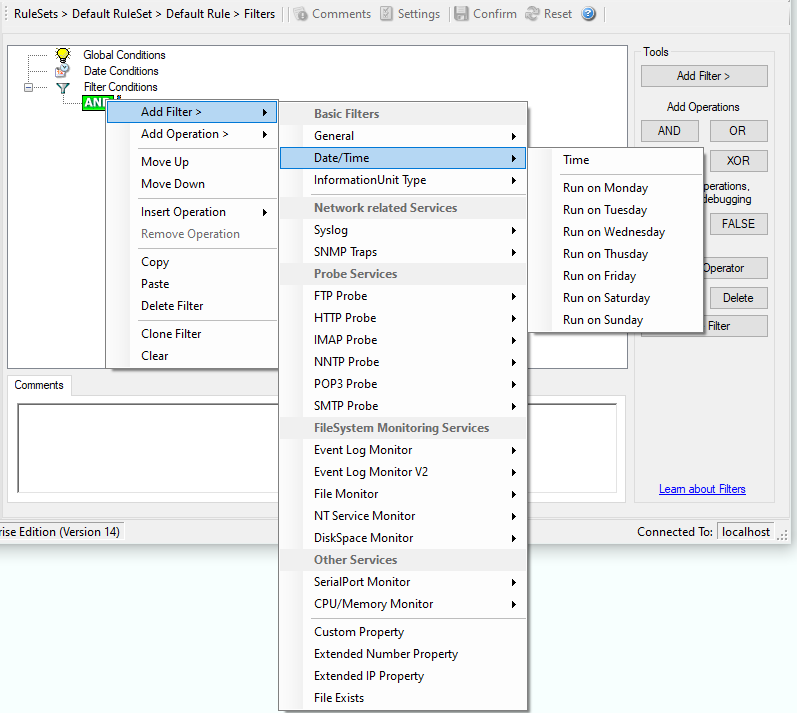 This filter condition is used to check the period in which an event occurred. For example, a Syslog message from a Cisco router saying that it dialed up is normal if it occurs during office hours. If it occurs at night, so, it is an alerting signal and an administrator might receive notification of this event (while he might otherwise decide to discard it). This can be done with the time setting.