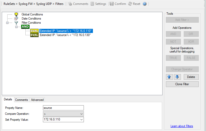 The filter you can see here will accept all IPs which lie between 172.16.0.110 AND 172.16.0.130. That means, that for every IP that