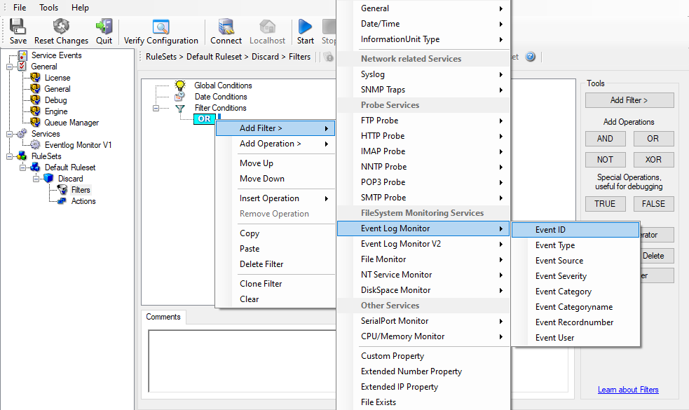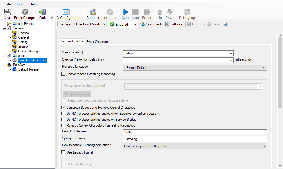 Of course we can only use a rule if we configure a corresponding service. To do so, right-click on “Running Services” and then select “Add Services”. Choose the desired “Service” from the context menu i.e. “Event Log Monitor” in this sample. Provide a name of your choice. In our sample, we call the service “Event Log Monitor”. Leave all defaults and click “Next”, then “Finish”. Now click on “Event Log Monitor” under “Running Services”. Your screen should look as follows: