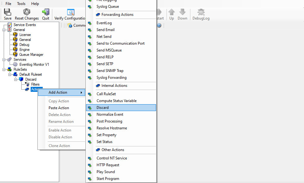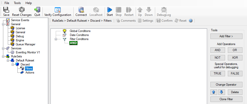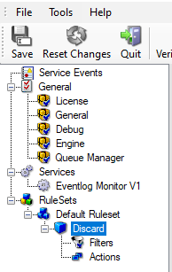 In the tree view, right-click “Defaults” below “RuleSets”. Then, click “Rules”, select “Add Rule”. Choose any name you like. In our example, we call this rule “Discard”. Then, expand the tree view until it looks like the following screenshot: