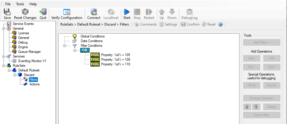 In this tutorial, we define a filter that discards such events. In our example, we assume that Events with the ID 105, 108, and 118 are not required. Please note that for simplicity reasons we only apply filter based on the event ID. In a production environment, you might want to add some additional properties to the filter set.