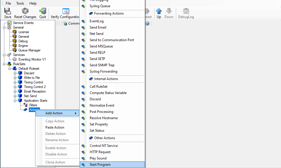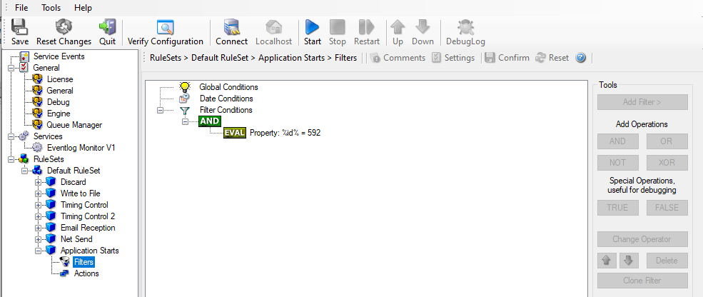 Our sample, on the other hand, is kept quite simple again. We just show how to generically start an exe file. To do so, we define a new rule named “Application starts”. Again, we use the imaginary event 592 as a filter condition. Therefore, the application starts whenever event 592 comes in.