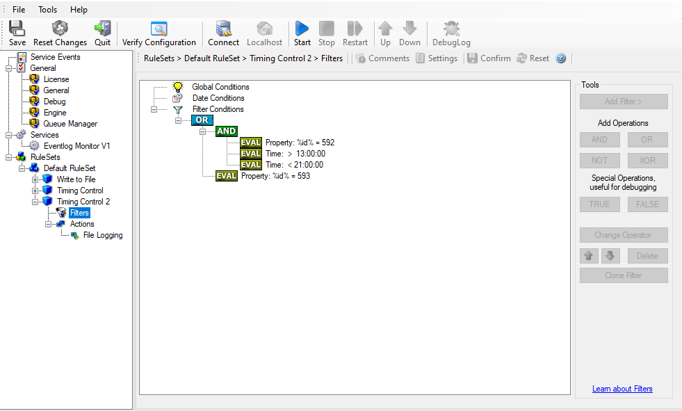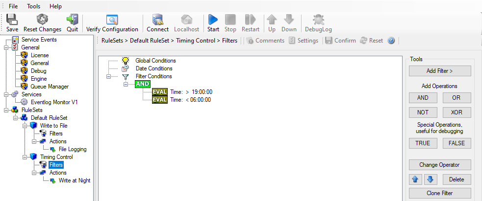 To make matters easy, we use this filter condition just to write nightly event log data to a different log file. In reality, time-based filters are often combined with other conditions to trigger time based alerts. However, this would complicate things too much to understand the basics.